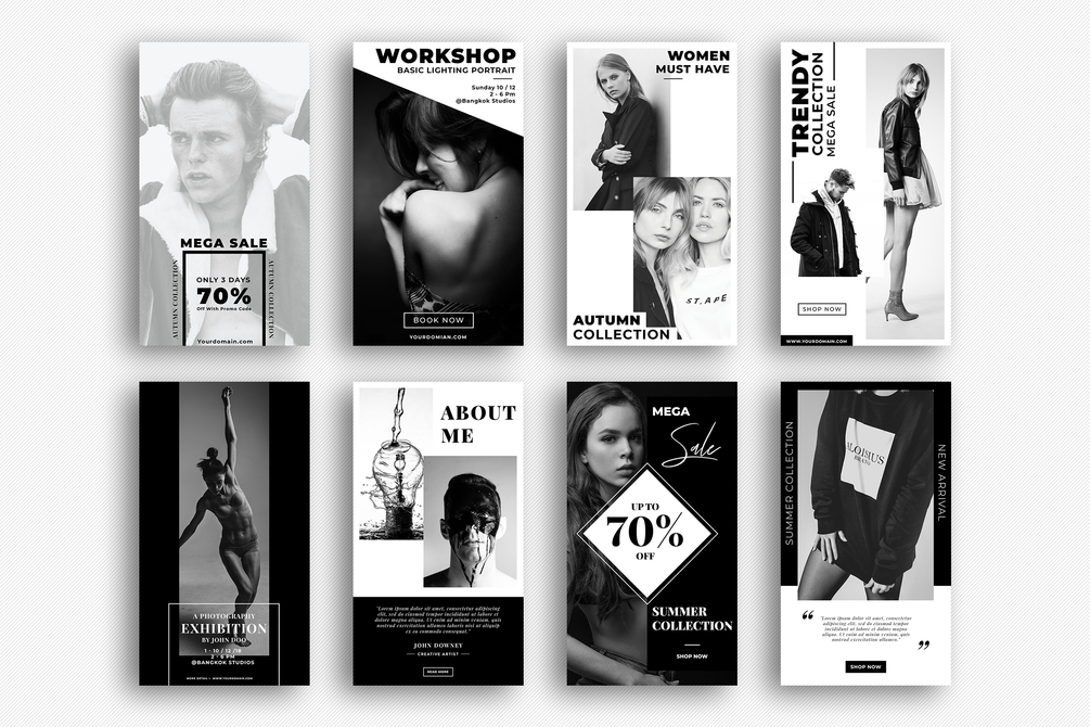 The Pattaya Instagram Stories Pack is filled with 20 Black & White Designs Photoshop Templates. they are fully customizable and compatible with Adobe Photoshop. Each set comes with free image included and Help File.